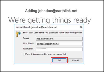 8 | Now the new account 'johndoe@earthlink.net' has been added to Outlook.. |