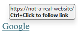 - Suspicious Links – Always hover over a link to see where the link is trying to send you. It is very easy for a spammer to make a link look like one site, but point to another. In the example below, notice how the actual link is not Google. You can see this by letting your mouse hover over a link briefly.